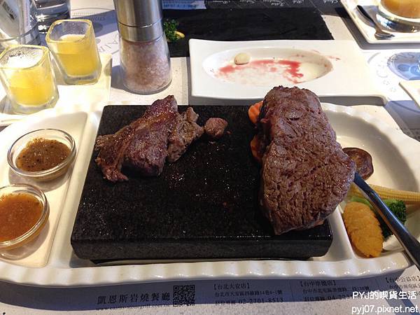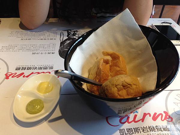 2015.06.23,當天我和友人是中午時間去用餐。餐廳的消費方式基本上有岩燒主餐跟一些午間輕食的部份,那因為我們買了雙人套餐的優惠卷所以就直接上主餐啦。凱恩斯岩燒屬於高價位的排餐店,不用優惠卷的話,餐點一客的價格從620-920都有,主餐套餐是包含開胃菜、麵包、沙拉、果醋飲、主餐、湯品、飲料、甜點,共八個品項。