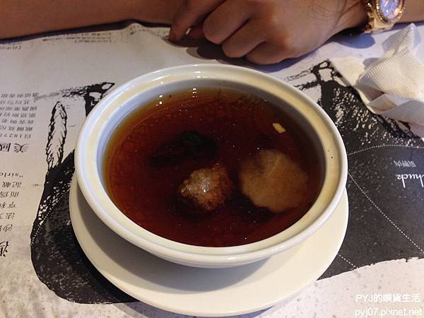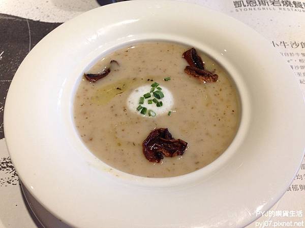 湯品我們兩人剛好點一濃一清,兩種的風味都很獨特。濃湯的湯頭有菇的鮮甜,融入在濃濃奶油湯中,是個濃郁的口感。而牛肉清湯的部份喝得到肉的鮮味和巴西蘑菇淡淡的香氣,也是很爽口。不過有一點我蠻好奇的是,湯品不像其他西餐廳是在主餐前上,而是在主餐之後,倒是挺有趣的。(友人特別提醒我寫食記的話要把這段寫進去XD)