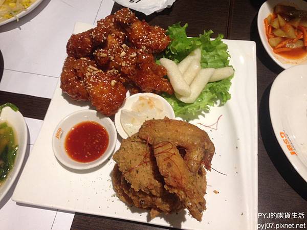 這道是三人套餐沒有的,所以要特別來介紹一下XD 原味的部份就是表皮酥脆的炸雞翅,肉的調味算是醃製得蠻入味的,很香不用沾醬就很好吃了~ 辣味的部份十分有韓國味道,是經典辣醬炸雞,表皮的口感跟醬料的味道都很到位,在此給予高分評價😜😜 右上角是炸年糕,吃起來就是外皮微酥、內部紮實Q彈的口感。中間附的醃蘿蔔片調味有點偏甜,和一般配韓式炸雞的偏酸醃蘿蔔不同,喜不喜歡就見仁見智,我自己是比較喜歡偏酸的比較解膩,這盤蘿蔔片的味道太淡了。