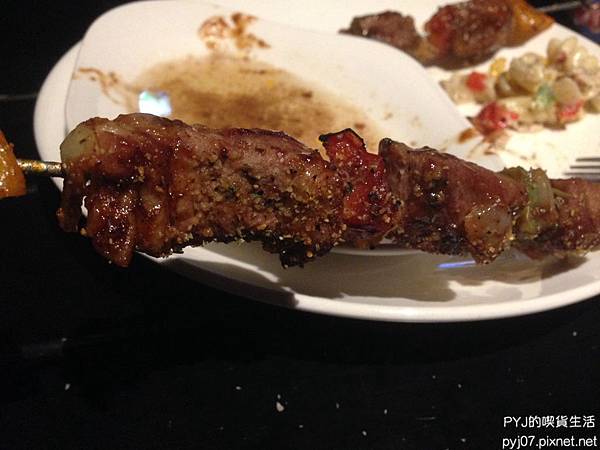 ▲來評論一下食物的口感,這個肉串的肉塊不會很油也不會很柴,咬起來是帶有點筋性的部位,口感Q彈好吃~黑胡椒調味更是增添了香氣,而穿插在肉塊之間的甜椒帶有微微甜味,整串吃起來真的就是美味來著😋😋 這盤串燒還有附烤麵包跟螺旋麵沙拉,吃起來很滿足阿~