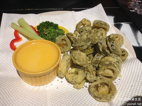 餐點選項五花八門實在不知道要選什麼,看了許久才決定點這盤炸辣椒XD 酥香外皮跟微辣帶有點juicy感的墨西哥辣椒,沾上起司醬,鹹鹹辣辣的超適合配酒XD 不配酒直接單吃也是很開胃的一道鹹食啦~