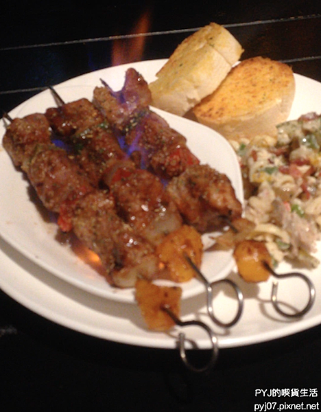 有第二杯酒勢必會勾起食慾想要來第二份餐點 ((誤) 其實是後來有看到隔壁桌點了一道著火的食物,很好奇是什麼,問了服務人員之後發現是串燒,於是就這樣給它點了一份XD 阿反正喝酒不就是要配肉嗎😜😜 而且上菜時是點著火的,很酷耶當然要點來瞧瞧😛😛 是說這張圖絕對不是因為我醉了所以糊掉XD 應該是因為動態的火焰讓對焦有點困難了啦~