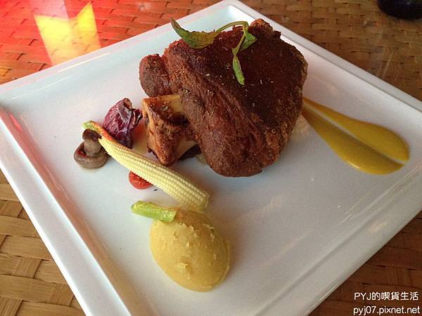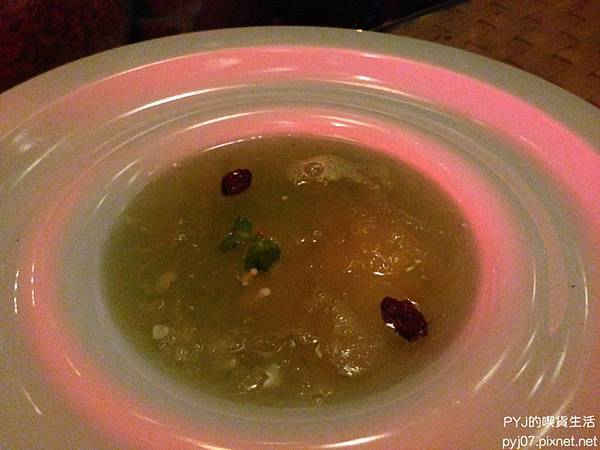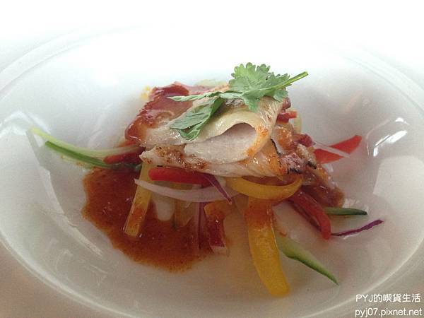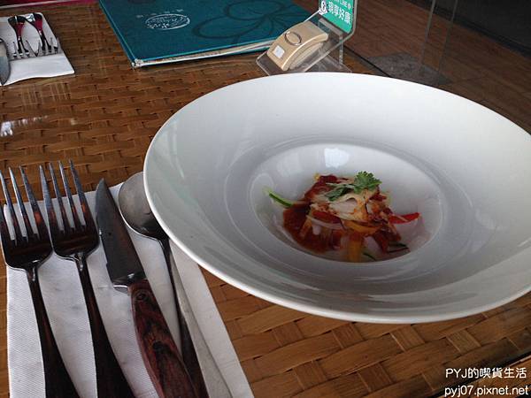 ▲今天這道前菜是清爽少油的里肌豬肉片搭上甜椒、紫洋蔥、黃瓜絲,淋上微酸辣的醬汁跟香菜做點綴。簡單的熱帶風味,酸辣醬汁蠻開胃的~