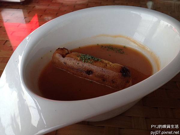 今天這道湯是番茄濃湯搭上番茄泡芙,還蠻特別的😮😮 湯的部份口感十分濃郁,番茄微酸的味道讓整體不會很膩。泡芙的部份番茄味也很明顯,香氣十足,真的是用心自製的特殊口味呢~