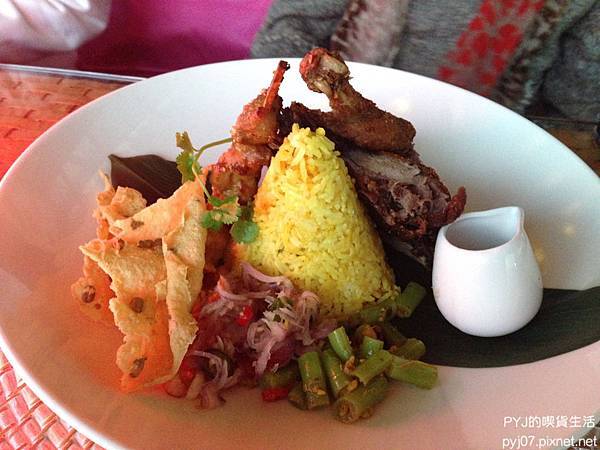 鴨腿的部份,老實說調味不知為何就會讓我想到便當店的炸雞腿XD 但鴨肉基本上較有韌度跟嚼勁,所以吃起來我覺得不會像一般肉雞腿那樣油膩,可以好好品嚐到酥脆外皮跟結實的鴨肉。旁邊的風味飯用的是泰國米,跟香料拌在一起的調味十分可口,配菜的部份也用南洋風的調味,整體算是有峇里島風情的感覺吧😂😂 雖然我自己其實沒去過峇里島就是XD 旁邊附的醬是用來沾鴨肉的,吃起來味道其實就像吃烤鴨用的甜麵醬那樣。