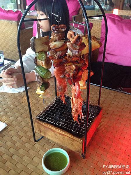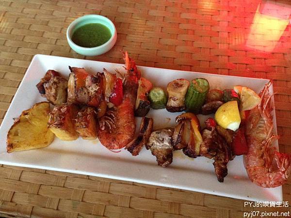 ▲超豐盛的串燒,上頭塗了微甜微鹹的特調烤肉醬汁,擠上一些檸檬汁,沾點旁邊附的青辣椒醬,吃起來很有熱帶異國風味阿~