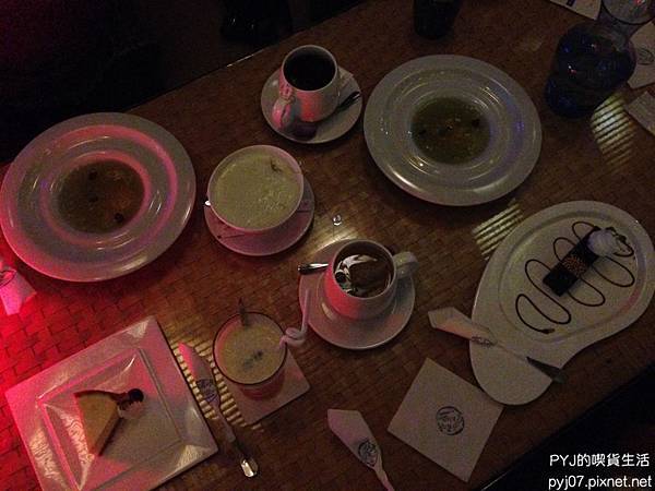到了甜點跟飲料上桌的時候已經入夜,所以接下來的照片都會偏暗😭😭 這家餐廳夜晚走一個浪漫氣氛路線,所以燈光都調得很微弱,部分靠桌面的小燈做輔助這樣😛😛