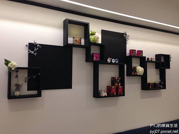 ▲牆上的櫥架走一個很有設計感的格子風,擺飾著一些茶葉罐及小物作為裝飾。