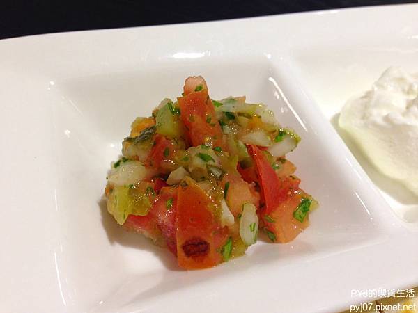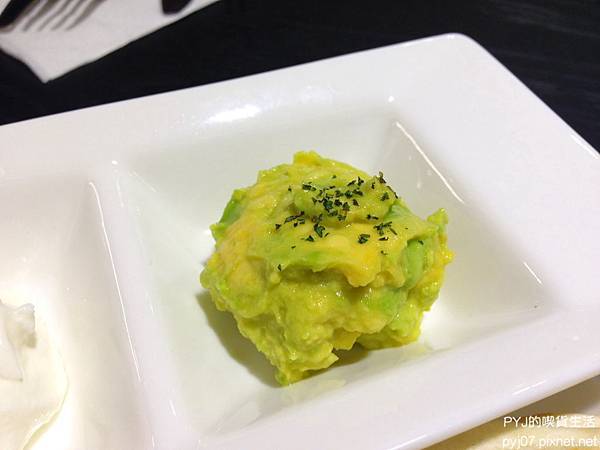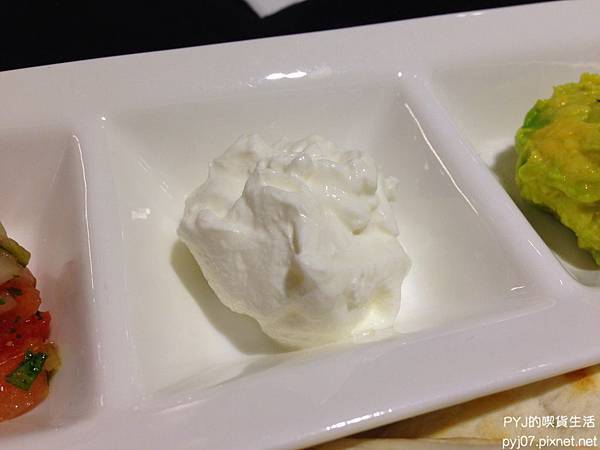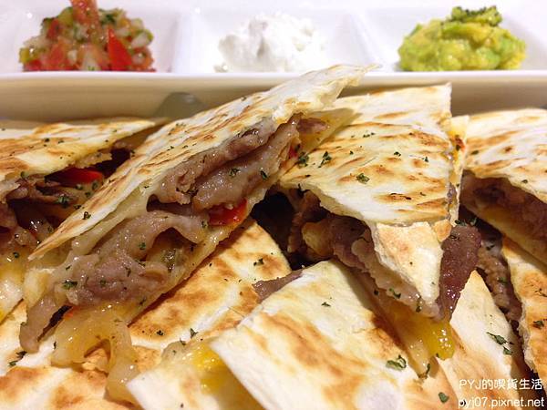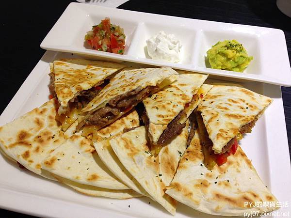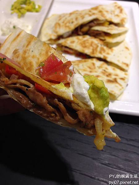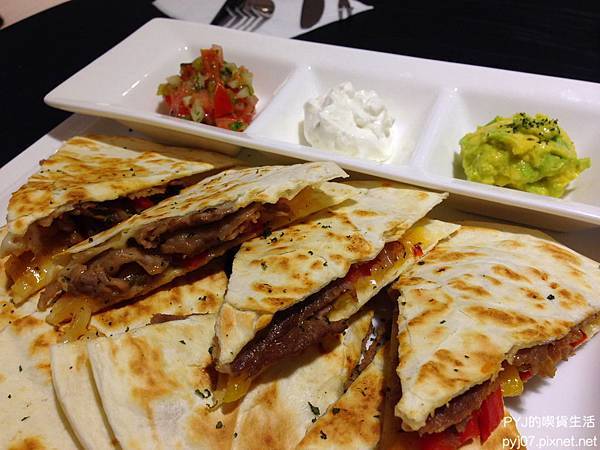 ▲裹上三種醬料一起吃,莎莎醬的酸跟鹹可以增添風味,配上酸奶則中和了油膩感,酪梨醬增加了整體口感的滑順。咬下去的瞬間,雪花牛那帶有點油脂同時有肉片嚼勁的口感,和香甜的洋蔥跟甜椒入口後整個融合成一種美妙的滋味XD 雖然不像正統墨西哥餅那般重口味,但該有的經典美味都在,而且不要太重口味其實比較能吃到食材最純的味道,也比較適合這種充滿高尚法式風情的店阿😂😂 不然到這種店吃個很重鹹又充滿烤肉味的東西說實在的也有點奇怪XD