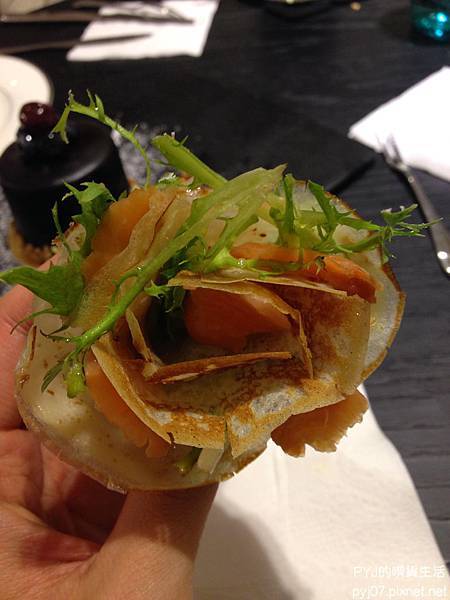 ▲這次提供的鹹品是可麗餅卷,裡面包的是煙燻鮭魚片。餅皮Q軟加上鮭魚片本身就有鹹味,不需其他過多的調味吃起來就很美味可口~