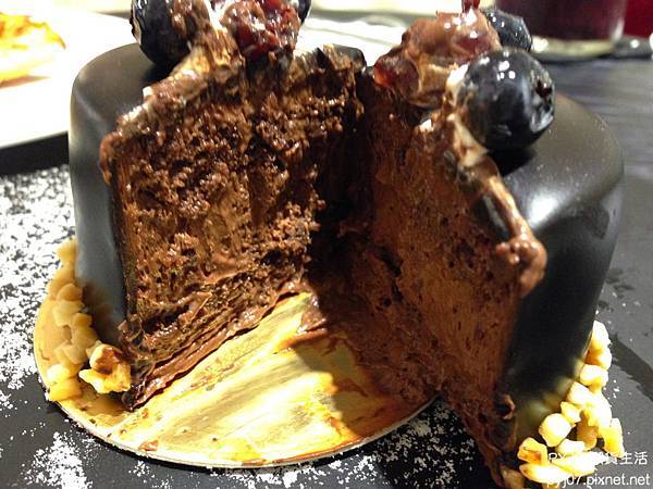 ▲硬生生把蛋糕剖開來拍照XD 照片不小心有點過曝了,還請各位讀者見諒😅😅 Anyway,可以看到裡面的蛋糕體很濕潤,口感上是很濃郁的巧克力香甜味~ 外層的鏡面巧克力帶有可可的苦甜味,搭配蛋糕體跟櫻桃一起入口後,仔細咀嚼可以品出香淳的巧克力味以及淡淡的酒香,很棒~
