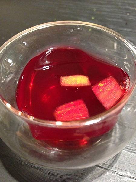 這個飲料可以做熱的或冰的,友人挑選,選擇做冰的。味道主要是莓果跟蘋果等水果組成的淡雅甜香。水果茶結合了茶的澀香和水果的甜,水果新鮮使得香氣可以突出,讓飲品除了具有順口的甜味及茶香,又能聞到清新的果香~