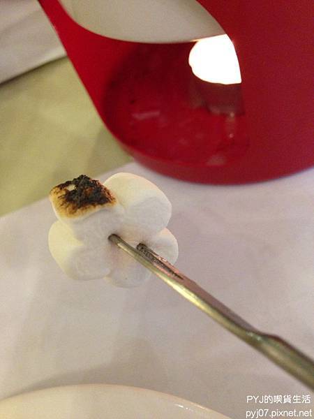 ▲最後吃得有點飽,來玩一下棉花糖😂😂 插了棉花糖塞到鍋子底座的燭台試圖來烤,可是火太難控制了一下就過頭燒焦XD 看來還是要嘛去燒烤店烤棉花糖,不然就是在那種露營的營火堆玩,哈哈。